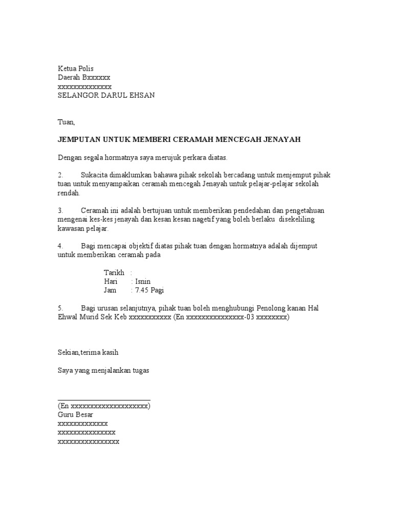 CONTOH SURAT JEMPUTAN CERAMAH-POLIS. Tuan JEMPUTAN MENYAMPAIKAN CERAMAH KEPENGGUNAAN KEPADA PELAJAR. Jemputan menyampaikan ceramah kepenggunaan kepada pelajar sekolah menengah dengan hormatnya perkara di.
